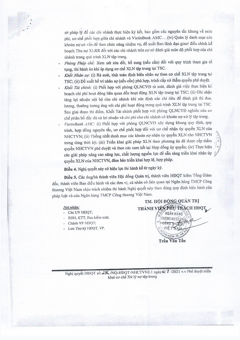 Nghị quyết của HĐQT NHCT VN về việc phê duyệt triển khai cơ chế Xử lý nợ tập trung